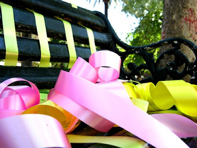La intervención consiste en trenzar cintas de colores a través de la estructura de una banca, en este caso bancas del sector del Parque Forestal y el Parque Los Reyes.